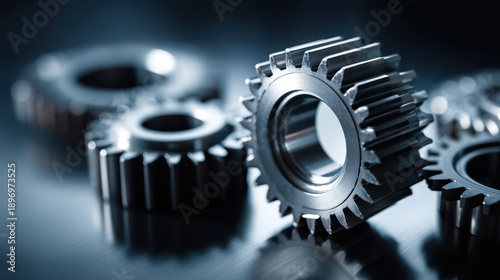 Precision metal gears on industrial surface, concept of components and production technologies in mechanical engineering