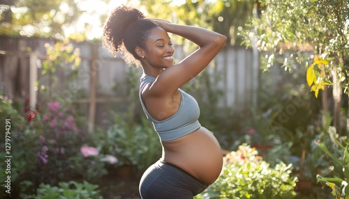 pregnant, woman, garden, smiling, hand, behind, head, sunlight, nature, maternity, fitness, physical exercise, lifestyle, health, baby, expecting, beautiful, african, american, ethnicity, black, hair, style, posing, blooming, flower, plant, greenery, fence, backyard, relaxation, calmness, contentment, motherhood, anticipation, family, love, care, joy, growth, happiness, sunshine, foliage, well-being, active, pregnancy