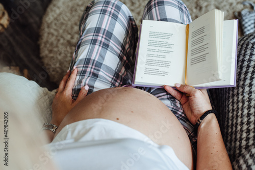 Pregnant woman reading a book in the living room lying on the couch. A young, expectant mother is reading a book on pregnancy and childbirth. Concept of pregnancy, motherhood, rest, expectation.