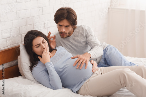 Pregnant woman suffering from morning nausea, worried husband soothing her.
