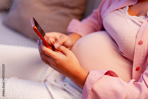 Pregnant woman using smartphone, connecting and communicating during maternity journey