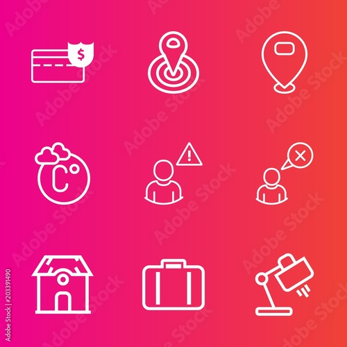 Premium set with outline vector icons. Such as home, globe, sign, temperature, concept, fahrenheit, money, cancel, banking, airport, thermometer, gps, center, location, cycle, baggage, interior, lamp