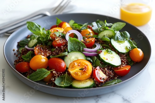 Prepare a vibrant colorful quinoa salad with cherry tomatoes and cucumber for healthy eating at home