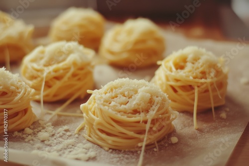 Prepped pasta nests, dusted with flour, await transformation into a delightful meal, exuding an air of culinary anticipation.