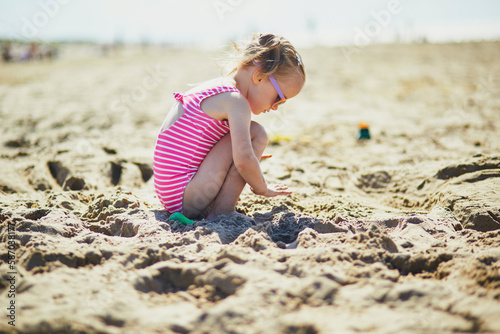 Preschooler girl playing on the sand beach at Atlantic coast of Normandy, France