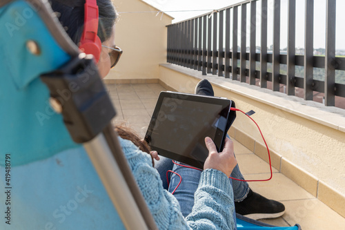 backview, woman, relax, terrace, home, sitting, weekend, tablet, technology, earphones, anonymous, happy, resting, watching, entertainment, female, adult, sunny day, looking, device, sun tanning, using, holding, outdoors, outside, relaxing, joy, enjoying, alone, one person, background, chair, lifestyle, leisure, caucasian, vacation, day, rest, enjoy