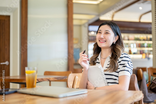 Pretty asian woman thinking as holding pen hugging notebook while sitting aside laptop at cafe table