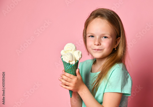 Pretty baby girl kid hold big ice cream in waffles cone with raspberry happy smiling ready to eat on pink