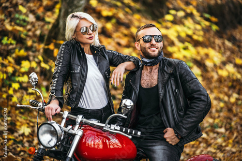 couple, motorcycle, motorbike, man, woman, bike, journey, travel, adventure, lifestyle, outdoors, drive, transport, human relationships, racer, vehicle, people, red, adult, transportation, leather jacket, forest, road, fashion, male, love, biker, sexy, ride, rider, motorcyclist, leisure, 2, trip, motor, style, female, together, leather, photogenic, concept, freedom, stylish, beard, blond, sunglasses, fall, autumn