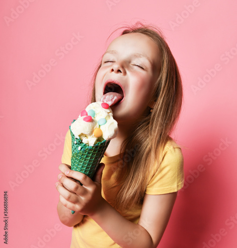 Pretty kid girl preschooler in t-shirt licks eats big vanilla ice cream with candies in waffles cone with closed eyes