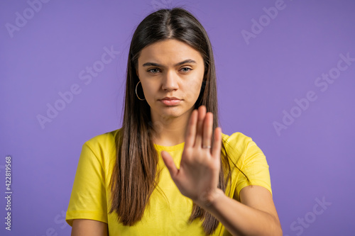 person, woman, stop, adult, signs, female, hand, young, gesture, isolated, studio, beautiful, gesticulate, brunette, no, studio shot, girl, background, lady, problem, serious, young adult, portrait, symbol, attractive, 20s, control, looking, model, one person, palm, standing, beauty, concept, anger, hispanic, brown hair, confident, conflict, emotion, expression, horizontal, indoor, reject, rejection, sad, showing, signal