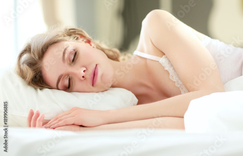 Pretty woman lying down on her bed at home.