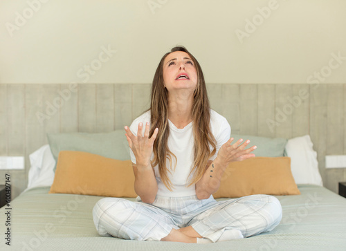 pretty woman screaming with hands up in the air. nightwear and bedroom concept