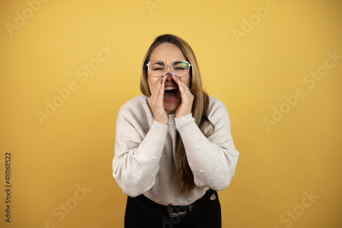 Pretty woman with long hair shouting and screaming loud with hands on mouth against yellow wall