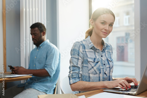 Pretty young woman looking at camera and browsing laptop while sitting in office near African-American colleague