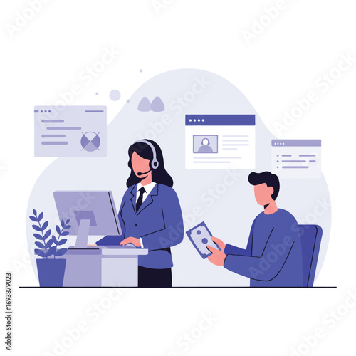 customer service, help desk, computer, headset, assistance, communication, problem solving, professional, white background, call center, telemarketing, interaction, consulting, researching, desktop, workplace, employee, person, office worker, helpline, graphic, corporate, solution, dialogue, telephone support