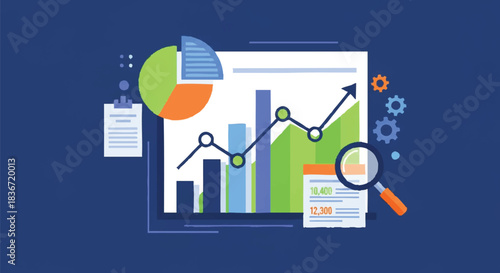 chart, graph, diagram, infographic, datum, statistic, analysis, report, document, clipboard, paper, magnifying, glasses, magnifier, gear, cog, arrow, line, bar, pie, circle, number, figure, business, finance, financial, marketing, research, strategy, planning, development, growth, progress, success, improvement, performance, management, investment, economy, accounting, inspecting, review, search, insight, intelligence, information, visualisation, presentation