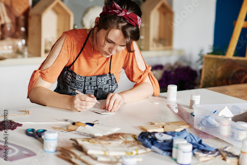 art, cutting, carve, sitting, artist, table, bricolage, workshop, studio, stamping, stamp, leisure, hobby, craft, handcraft, drawing, painting, decoration, pattern, linoleum, technique, print, creativity, creative, design, concentration, caucasian, young, woman, female, white, girl, person, people, adult, adult, 20s, young adult, young adult, young person, grown-up
