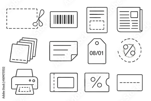 Printable Coupon Icons. Line style icons of printable coupons: dotted rectangle with scissors, paper coupon with barcode, printed