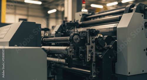 Printing press rollers and mechanisms inside a factory. Automated production machinery for large scale commercial printing for banner, poster, or blog post.