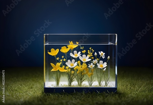 Pristine glass receptacle exhibiting a carefully selected grouping of distinct, miniature flowers embedded within a placid grassy backdrop