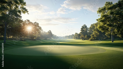 Pristine golf course with a hole framed by majestic trees at sunrise..