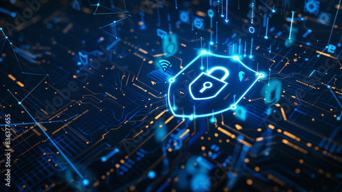 Privacy safety concept featuring a lock icon and shield and tech elements emphasizing data protection and security