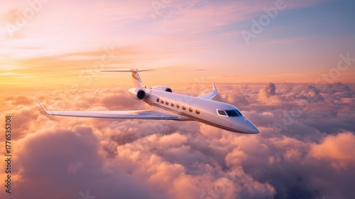 Private business jet flying high above the clouds during a sunset or sunrise sky. Transportation concept for travel and luxury lifestyle.