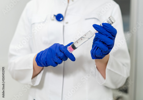 Pro prepares vaccine syringe. A healthcare worker holds a syringe filled with medication, ready for vaccination in a clinical setting.