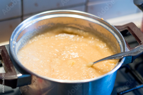apple, cooked, saucepan, cook, boiled, breakfast, cooking, delicious, dessert, eat, food, freshness, fruit, green, health, healthful, home, homemade, household, ingredient, jam, jar, jelly, marmalade, natural, nourishment, preserve, product, slice, snack, widener, spreading, sugar, sweet, taste, traditional, vitamin, yellow, healthy, pan, stainless steel, kitchen, stir