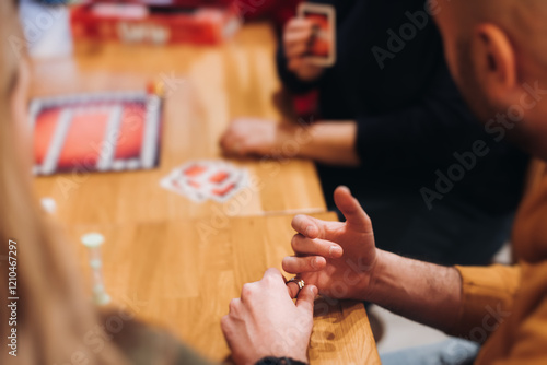 Process of playing tabletop board game on the table, fun with friends and family in room indoors, board game party concept, company group of students adults play board games, roll the dice on game map