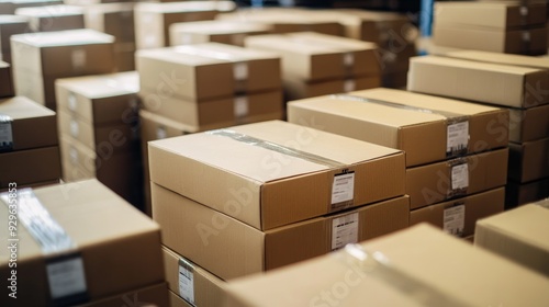 Product boxes stacked and labeled, ready for shipping, emphasizing the scale of online business operations.