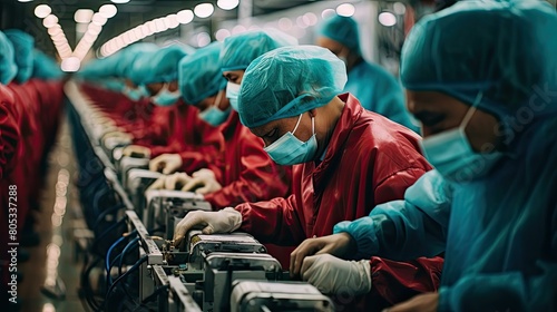 production, equipment, illustration, mask, factory, men at work, assembly, global, effort, demand, protective, covering, pandemic, manufacturing, face, high, row, diligent