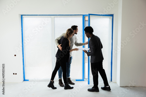 Professional attractive handsome african american dark skinned real estate agent shows every aspect of new building after renovation. Loan house in debt.