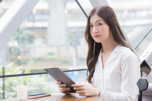 Professional beautiful young Asian business woman is looking at camera in her hands tablet or notepad while she is sitting at coffee shop among business background in the city.