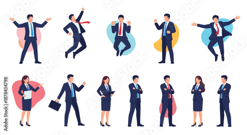 business, people, character, set, collection, man, woman, pose, action, gesture, jumping, happy, success, achievement, victory, standing, walking, briefcase, document, leader, employee, manager, professional, corporate, suit, formal, group, teamwork, diversity, variety, flat, illustration, vector, design, element, avatar, icon, men at work, job, career, motivation, energy, movement, isolated