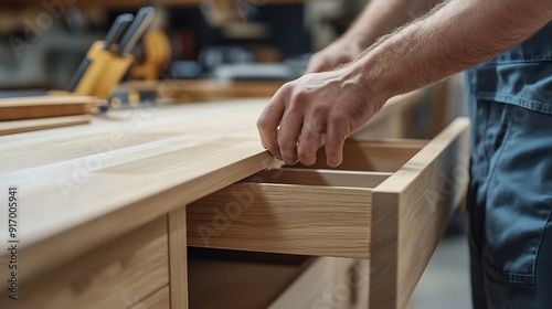 Professional Caucasian Cabinetmaker Fitting Kitchen Furniture Drawer : Generative AI