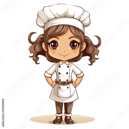 chef, girl, cartoon, character, brown, line, vector, illustration, young, cook, cooking, culinary, uniform, chef's hat, smiling, happy, cute, kitchen, food, eatery, children, person, adorable, occupation, profession, children, female, professional