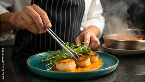 chef, cooking, eatery, plating, scallop, epicure, food, seafood, kitchen, professional, culinary, tongs, dish, meal, fine dining, preparation, garnish, presentation, detail, precision, uniform, apron, hand, healthy, fresh, delicious, savoury, upscale, elegant, art, beautiful, skill, expertise, steam, hot, occupation, career, work, sauce, greener, vibrant, closeup, serving, industry, indoor, table, nobody