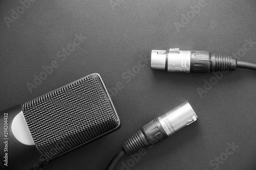 Professional condenser studio microphone and XLR cable closeup on a black background. Music,art and inspiration concept.