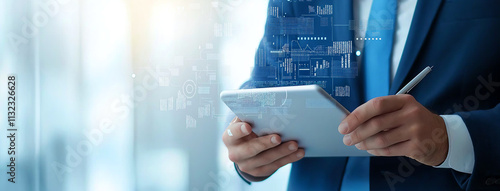 Professional in a suit using a digital tablet, symbolizes modern business communication and technology integration in a corporate setting.