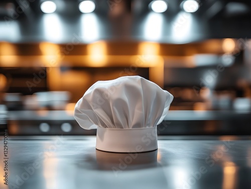 Professional kitchen interior, sleek and modern design, warm and cinematic lighting, with a chef's hat prominently placed on a clean and polished counter in the foreground