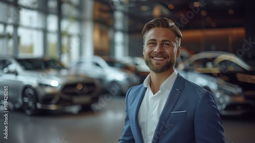 Professional Luxury Car Salesman Smiling in Luxury Showroom with High-End Vehicles