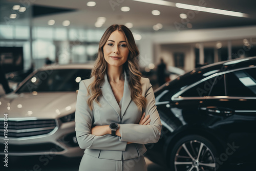 Professional luxury car saleswoman in luxury showroom. Auto dealership office. Car dealer business. woman in showroom. Expensive car. Automotive industry. Luxury car agent