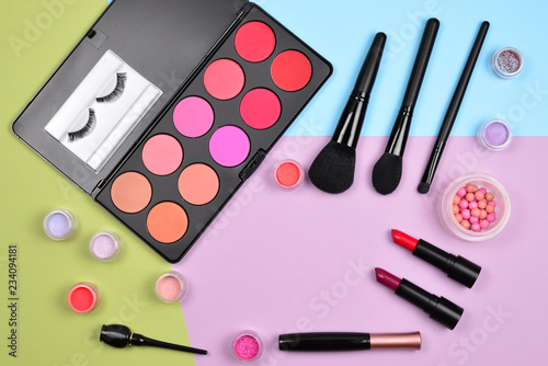 Professional makeup products with cosmetic beauty products, blushes, eye liner, eye lashes, brushes and tools.