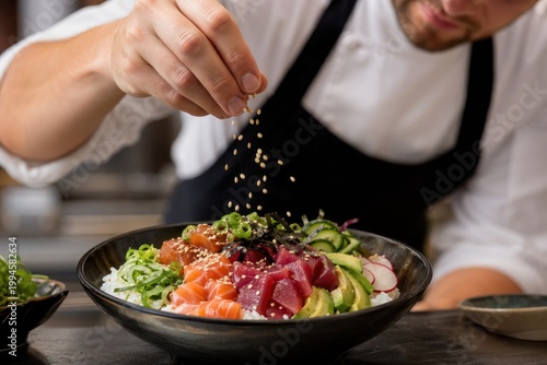 Professional male chef sprinkling sesame seeds on a fresh poke bowl with raw tuna, salmon, and avocado in a restaurant kitchen, focused action, vibrant colors, culinary concept.