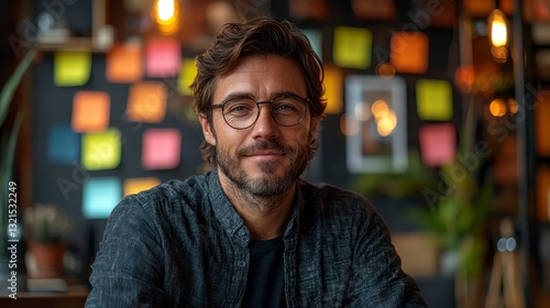 Professional Man Smiling in Modern Office Space with Colorful Sticky Notes