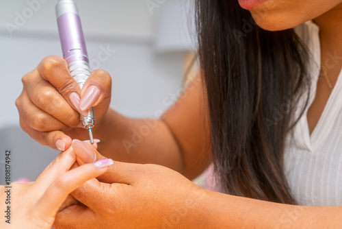 manicure, professional, nail, treatment, beauty, salon, care, manicurist, electric, file, drill, client, hand, service, spa, woman, well, being, grooming, pampering, cuticle, preparing, polishing, shaping, fingernail, cosmetic, procedure, skilled, expert, close, up, detail, health care, hygiene, elegant, relaxation, routine, modern, equipment, healthy, nail, hand, aesthetic, beautician, technician, applying, working