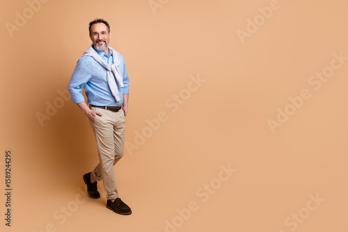 man, mature, male, businessman, gentleman, photogenic, beard, old, elderly, retired, senior, casual attire, elegant, style, stylish, trendy, fashion, model, leisure, beige, background, advertising, shopping, promoting, work, men at work, job, corporate, professional, standing, confidence, pose, happy, cheerful, personality, friendly, shirt, pant, charming, classic, relaxed, expression, authentic, business, age, executive, office, going, copy space