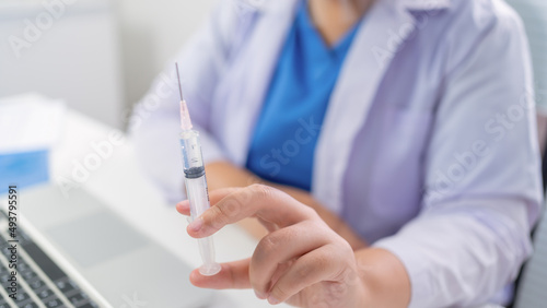 Professional medical asian woman doctor with Syringe medical injection in hand vaccine injecting health drug vaccination influenza fight against virus covid-19